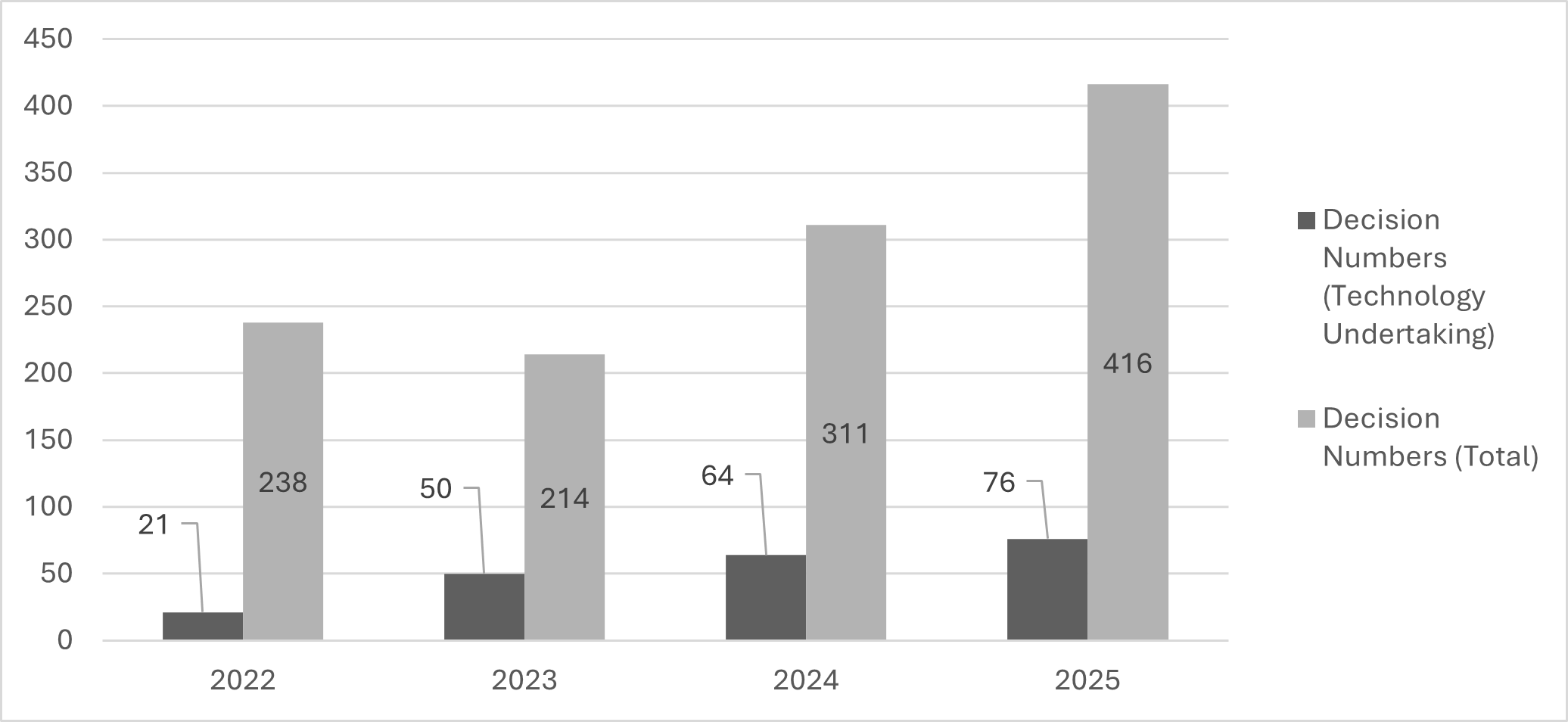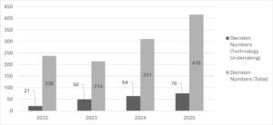 The chart below illustrates the annual distribution of TCA decisions concerning technology undertakings between 2022 (i.e., when the amended regulation entered into force), and 2025, together with the total number of merger notifications reviewed by the TCA during the same period: